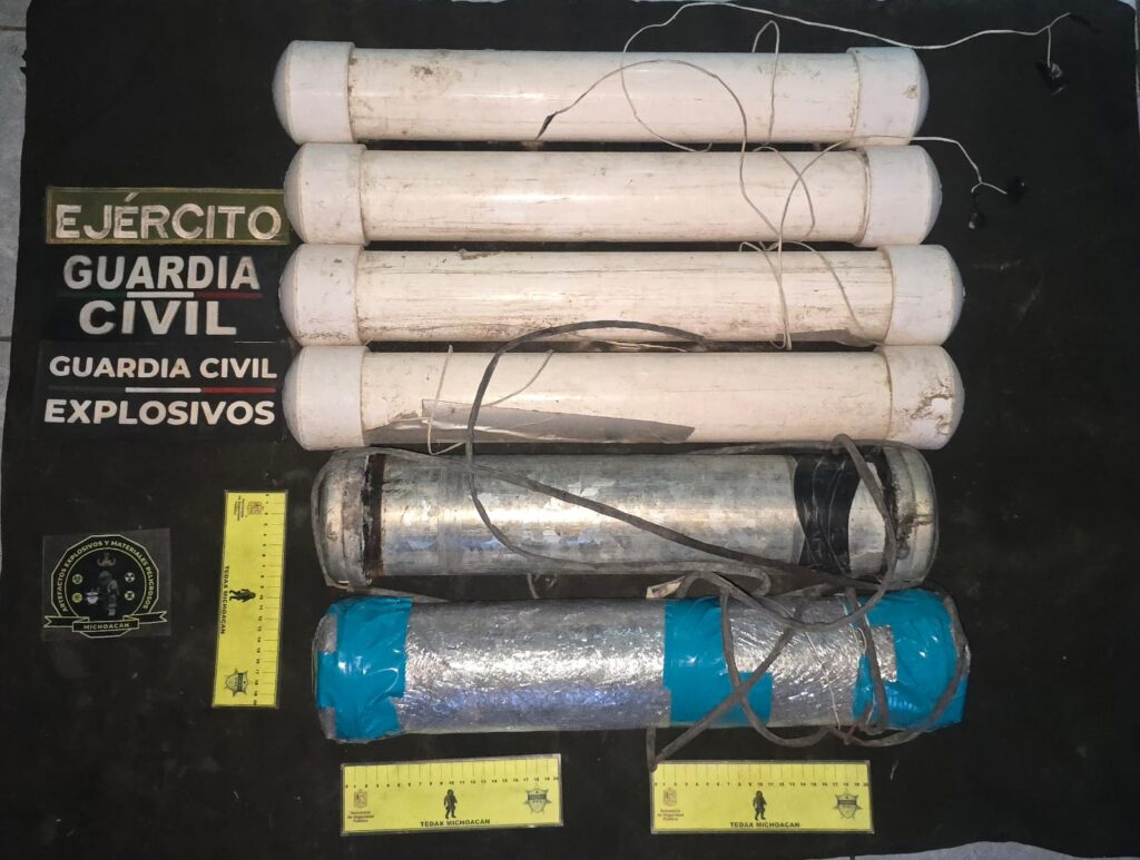 Resultado del operativo interinstitucional en el municipio de Zinapécuaro, coordinado entre las secretarías de Seguridad Pública (SSP) y de la Defensa Nacional (Defensa), se logró la detección e inhabilitación de seis artefactos explosivos.