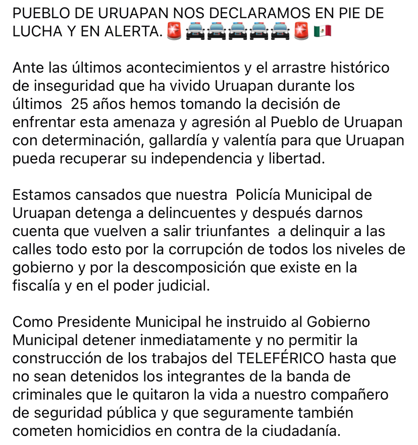 “Como Presidente Municipal he instruido al Gobierno Municipal detener inmediatamente y no permitir la construcción de los trabajos del TELEFÉRICO hasta que no sean detenidos los integrantes de la banda de criminales que le quitaron la vida a nuestro compañero de seguridad pública y que seguramente también cometen homicidios en contra de la ciudadanía”, refirió Manzo.