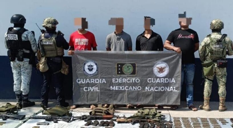 En dos acciones realizadas por las secretarías de Seguridad Pública (SSP) y de la Defensa Nacional (Defensa), se logró el aseguramiento de cinco sujetos en posesión de armas de fuego, cargadores, cartuchos y equipo táctico con siglas alusivas a una célula delincuencial.