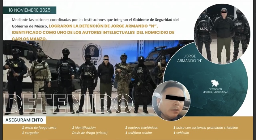 “Como resultado de un trabajo de inteligencia exhaustivo y coordinado, la Fiscalía General del Estado de Michoacán (FGE), Secretaría de Seguridad y Protección Ciudadana (SSPC) y la Secretaría de Seguridad Pública (SSP), se cumplimentó una orden de aprehensión contra Jorge Armando “N”, El Licenciado, identificado como presunto autor intelectual del homicidio del presidente municipal de Uruapan, Carlos Manzo, ocurrido el pasado 1 de noviembre.