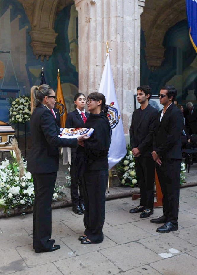 Durante el evento la rectora realizó la primera guardia de honor e hizo entrega de la Bandera Nicolaita a los familiares de la destacada abogada.