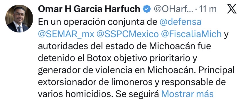 Desde Puebla, el secretario de Seguridad Pública del país, Omar García Harfuch, hizo el anuncio oficial de la captura del presunto delincuente y exaltó la coordinación entre las fuerzas de seguridad federales y de Michoacán, para lograr la aprehensión.