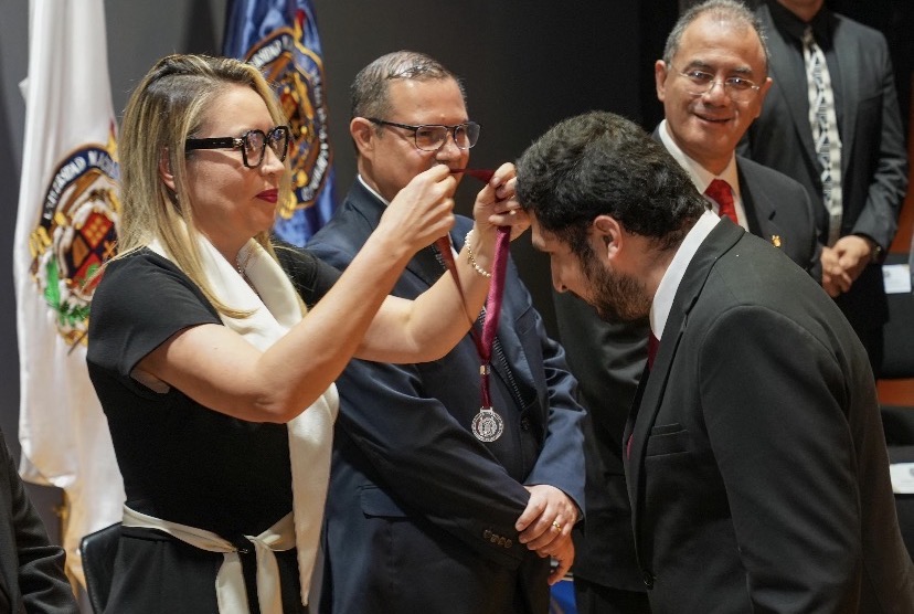 En representación de las egresadas y egresados que recibieron la medalla, Jorge Miguel Santacruz, compartió que este reconocimiento no es ùnicamente un mérito individual es en realidad el reflejo de un proceso formativo riguroso, exigente y profundamente humano, “que se construye dia a dia en las aulas, laboratorios, clínicas y espacios académicos de nuestra Universidad”. Agregó que el obtenerlo implica un compromiso renovado, ejercer la profesión con ética, seguir produciendo conocimientos de calidad y contribuir activamente al desarrollo científico, social y humano.
