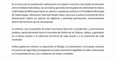 Gobiernos de Jalisco y Michoacán piden a Tepalcatepec que su policía no opere fuera de su jurisdicción