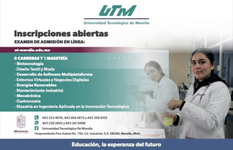 Aún hay espacio para que jóvenes que deseen cursar una de las 7 carreras que ofrece la Universidad Tecnológica de Morelia (UTM) pueden obtener este viernes 13, su registro para participar en el examen de admisión que en la modalidad en línea se realizará este sábado 14 de enero.