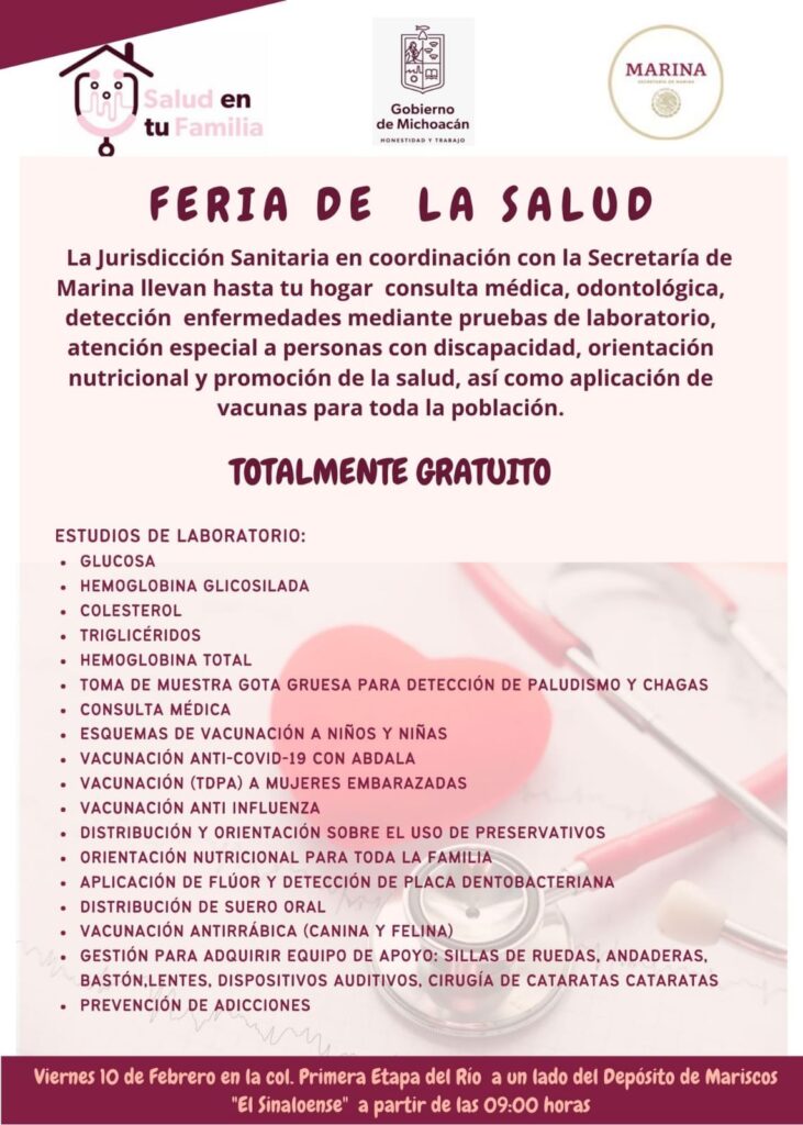 Con el propósito de llevar a la población servicios médicos gratuitos y oportunos, la Secretaría de Salud de Michoacán (SSM), a través del programa Salud en tu Familia, llevará a cabo el próximo 10 de febrero la Feria de la Salud en el municipio de Lázaro Cárdenas.