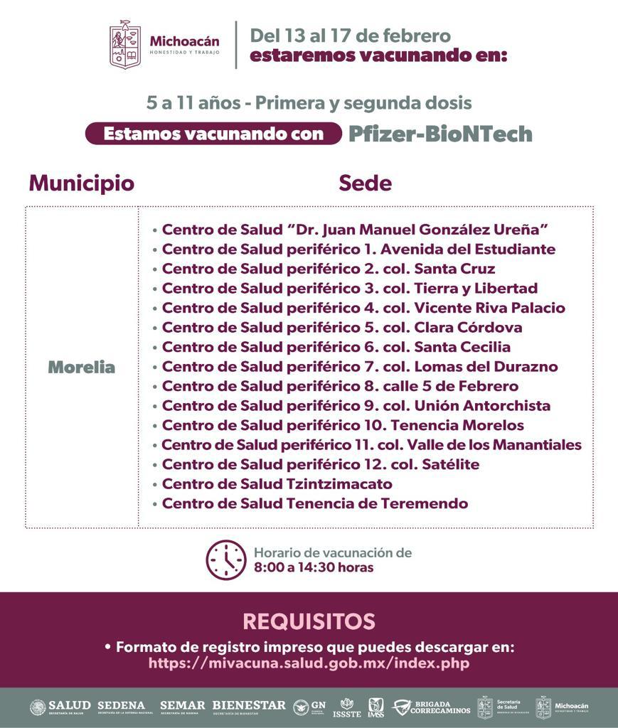 La Secretaría de Salud de Michoacán (SSM) recuerda a la población que los 15 centros de salud que hay Morelia continúan con la vacunación contra el COVID-19 de 8:00 a 14:30 horas.