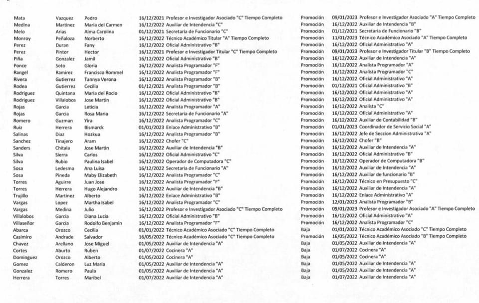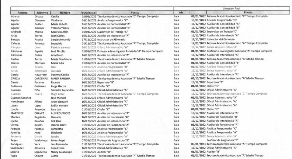 Según un listado que se ha hecho circular a través de las redes sociales, entre los nombres figura incluso el hijo de Raúl Cárdenas y una sobrina, identificados como José Nicolás Cárdenas España y Ana Karen Cárdenas Nuñez, respectivamente.