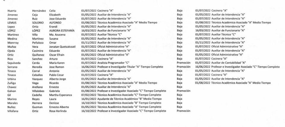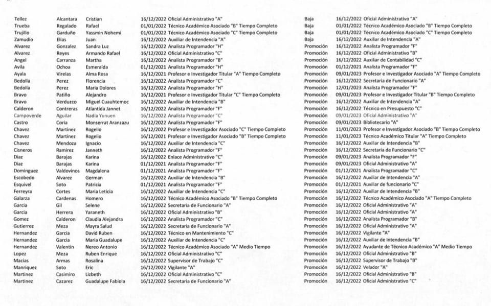 Tal lista contiene además el nombre de la esposa del ex tesorero nicolaita, Rodrigo Gómez Monge, identificada ella como Yassmin Nohemí Trujillo Garduño. También figuran con promociones el ex secretario general, Pedro Mata Vázquez y el titular de Planeación Institucional, Julio Vargas Medina.