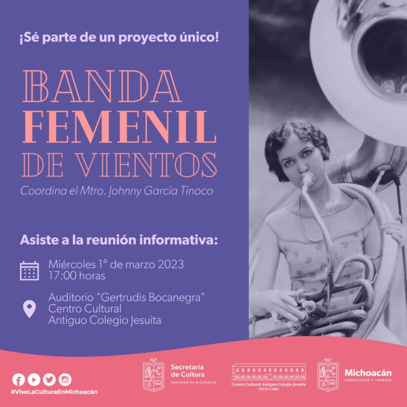 En el marco del Día Internacional de la Mujer, la Secretaría de Cultura de Michoacán (Secum), a través del Centro Cultural Antiguo Colegio Jesuita, invita a la reunión informativa para ser parte de la Banda Femenil de Vientos, coordinada por el maestro Johnny García Tinoco.