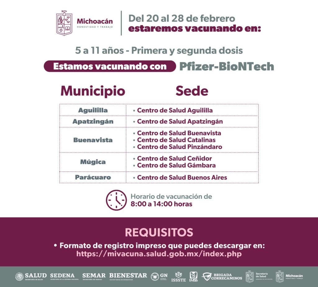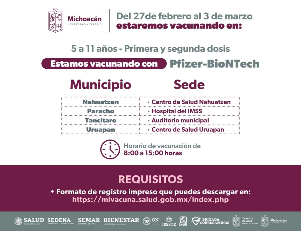 Así como en Jacona, Zamora, Cotija, Ecuandureo, Pajacuarán, Vista Hermosa, Nahuatzen, Paracho; Tancítaro, Uruapan y Zacapu, donde aplicará el biológico de la farmacéutica Pfizer-BioNTech.