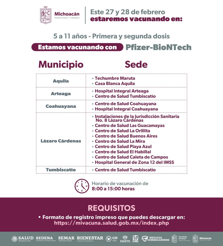 Del 27 de febrero al 5 de marzo, el sector salud vacunará a menores de 5 a 11 años contra el COVID-19 con primeras y segundas dosis en 24 municipios del estado.