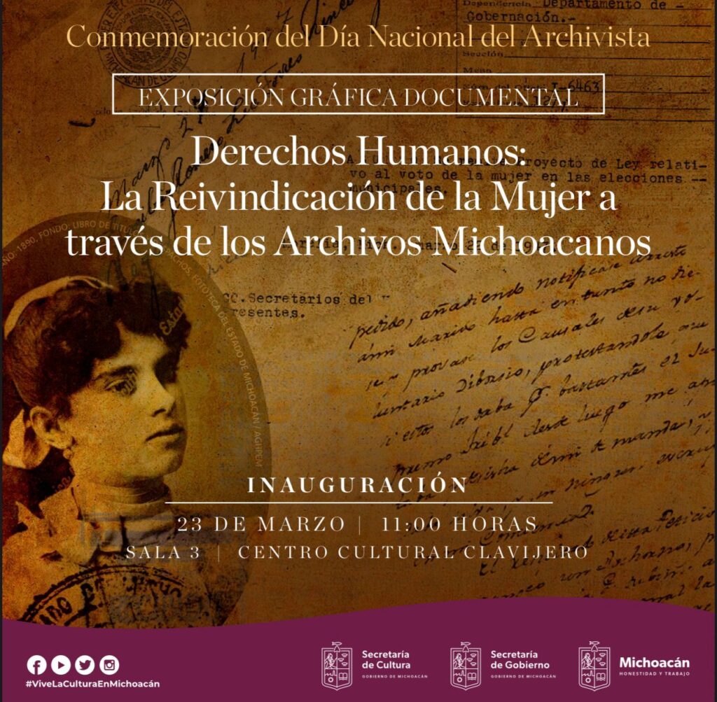 La Secretaría de Gobierno, a través de la Dirección de Archivos del Poder Ejecutivo y en coordinación con la Secretaría de Cultura, inaugurará la exposición gráfica documental denominada, “Derechos Humanos: La Reivindicación de la Mujer a través de los Archivos Michoacanos”.