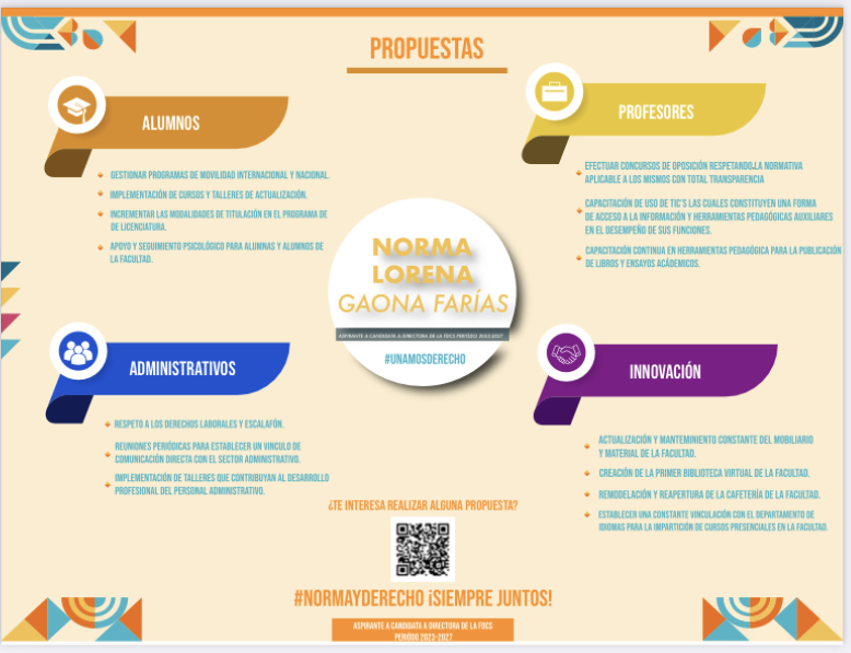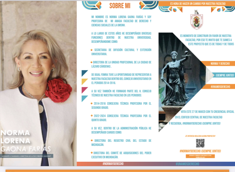 Con amplia experiencia al interior de la Facultad de Derecho y Ciencias Sociales de la Universidad Michoacana de San Nicolás de Hidalgo (UMSNH) y respalda por el ejercicio en varios rubros de la administración pública, Norma Lorena Gaona Farías se perfila para alcanzar el mayor número de simpatías durante la auscultación interna rumbo a la elección de director de esa dependencia nicolaita.