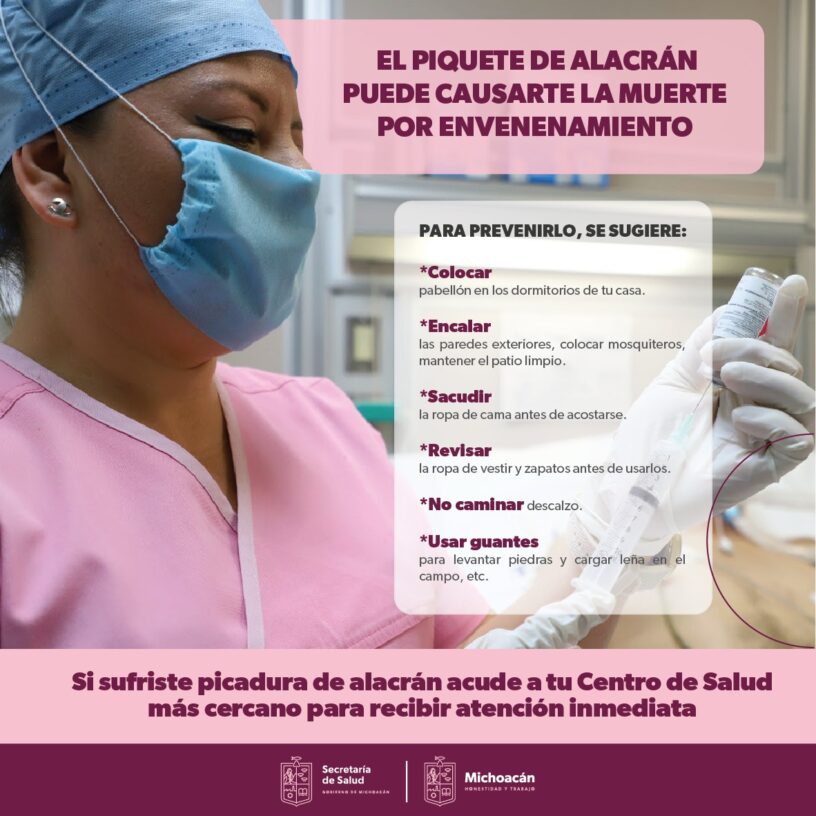 La Secretaría de Salud de Michoacán (SSM) se encuentra preparada y lista con suero antialacrán para atender a la población que sufra alguna picadura, durante esta temporada de calor donde se incrementa la incidencia de casos.