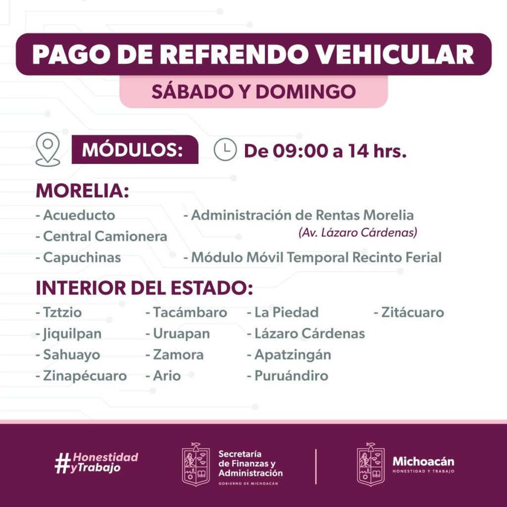 Este fin de semana, la Secretaría de Finanzas y Administración (SFA) del Gobierno de Michoacán, abrirá algunos de sus módulos y ventanillas en Morelia y en las principales ciudades de la entidad, con el objetivo de apoyar a las personas interesadas en pagar el refrendo vehicular 2023 y que por diversos motivos no puedan hacerlo a través de la plataforma https://sfa.michoacan.gob.mx/tvehicular/.