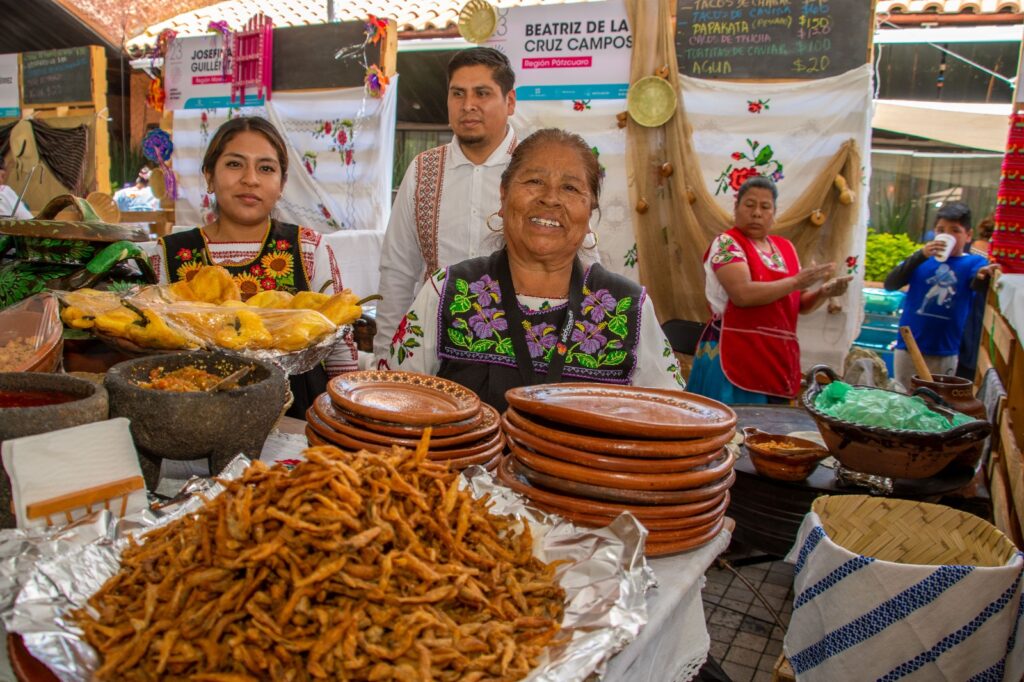 En la zona gastronómica, 20 cocineras y cocineros tradicionales de las siete regiones turísticas del estado preparan más de 200 platillos como enchiladas con cecina, morisqueta, uchepos, atapakua, mole rojo, churipo, corundas, charales, pozole, papakata, olla podrida, trucha, asado de cerdo, birria, mole verde, atoles, sopa tarasca, huazontle, frijoles puercos, chile de mango con queso, y aporreadillo, entre otros.