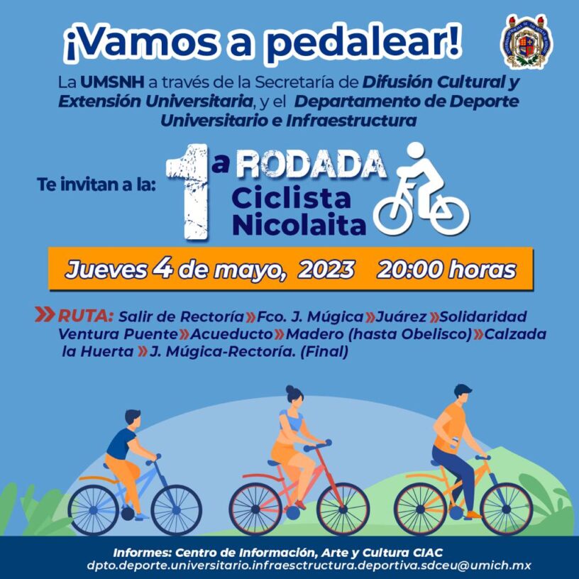 La Universidad Michoacana invita a todos y todas a unirse a la Primera Rodada Ciclista Nicolaita que se llevará a cabo el próximo jueves 4 de mayo, en punto de las 20:00 horas, teniendo como punto de partida el edificio de Rectoría de la Máxima Casa de Estudios.