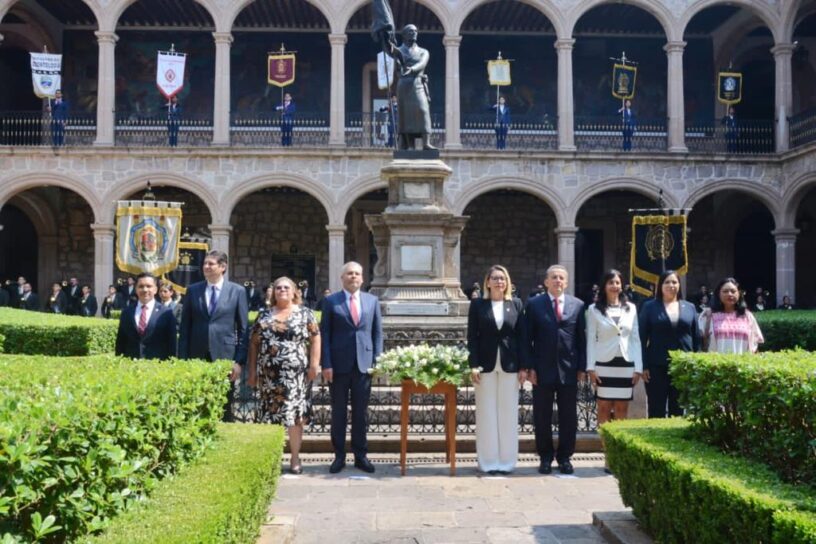 El Colegio Primitivo y Nacional de San Nicolás de Hidalgo fue el marco para conmemorar el nacimiento del Padre de la Patria, con la presencia de los representantes de los tres Poderes del Estado, funcionarias y funcionarios estatales y municipales, así como exrectores, directivos/as y estudiantado.