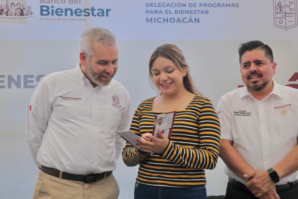 El gobernador Alfredo Ramírez Bedolla y el subsecretario de Empleo y Productividad Laboral de la Secretaría del Trabajo y Previsión Social, Marath Bolaños López, entregaron tarjetas del Banco del Bienestar a beneficiarios del programa “Jóvenes Construyendo el Futuro”.