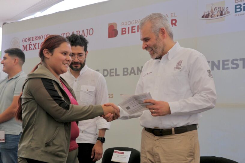 El gobernador Alfredo Ramírez Bedolla y el subsecretario de Empleo y Productividad Laboral de la Secretaría del Trabajo y Previsión Social, Marath Bolaños López, entregaron tarjetas del Banco del Bienestar a beneficiarios del programa “Jóvenes Construyendo el Futuro”.