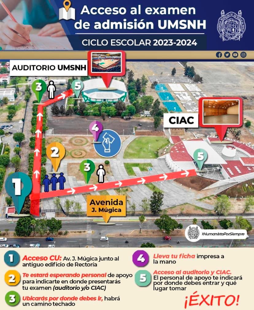 Para el turno vespertino el ingreso al examen será a partir de las 14:00 horas El inicio de la evaluación será desde las 15:00 horas. El acceso al recinto será sobre la avenida Francisco J. Múgica, a la altura del panteón municipal. Se recomienda llegar con anticipación, pues una vez que cierren las puertas de acceso ya nadie más ingresará.