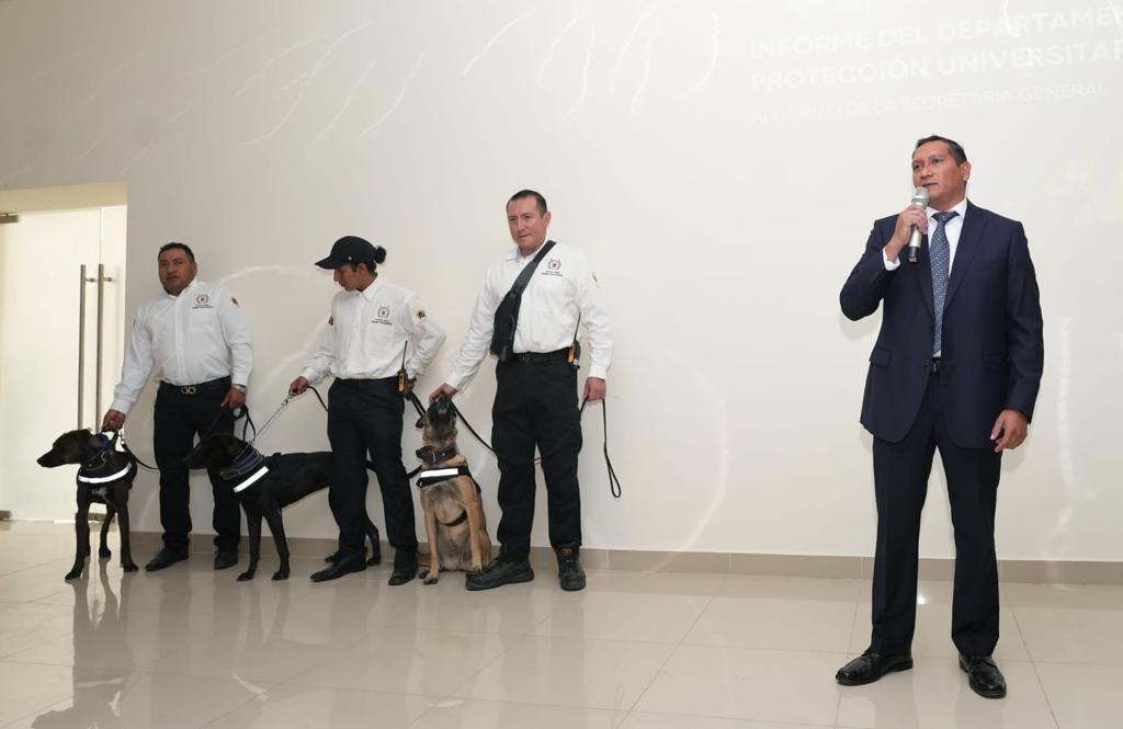 Acompañado del personal que integra el departamento y de la Unidad Canina que adoptó la institución, indicó que las labores de seguridad se realizan los siete días de la semana, por lo que resaltó el gran compromiso que tienen todas y todos quienes conforman el equipo para velar por la seguridad de la comunidad nicolaita.