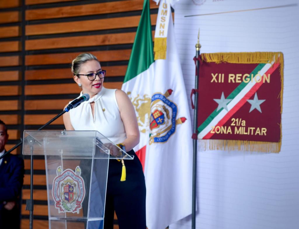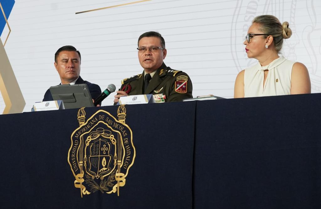 Frente a directores y directoras de distintas instituciones nicolaitas, de la comunidad estudiantil, docente y administrativa, la rectora agradeció la presencia del general y reconoció la labor que realiza el Ejército Mexicano, tras señalar que la historia de Michoacán no podría contarse sin la participación de dicha institución.