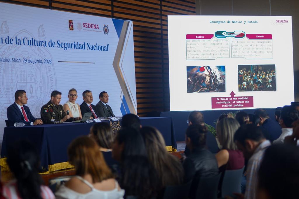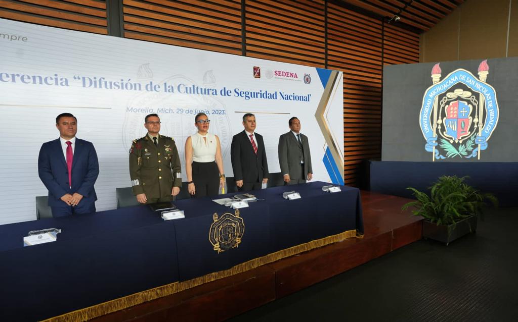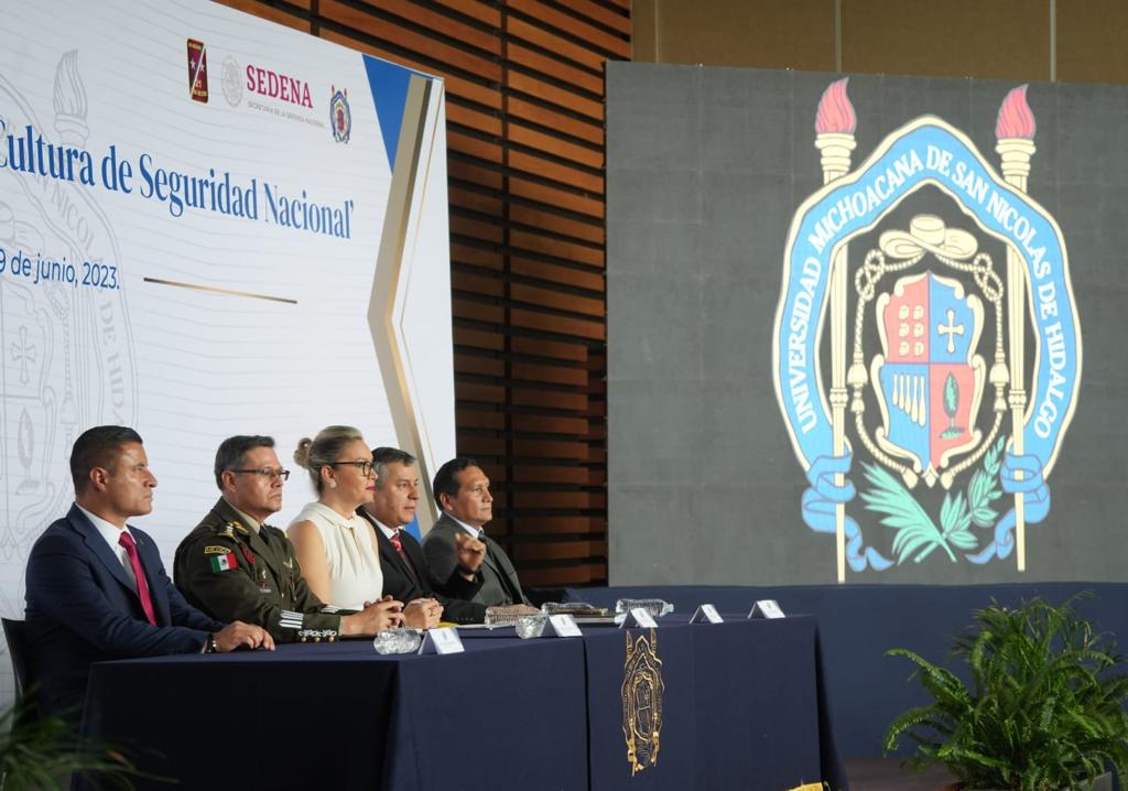 Es muy importante que sepan todos ustedes, no venimos a militarizar nada, sí venimos a participar si ustedes así me lo piden, pero no con las armas sino con el conocimiento, afirmó el general de Brigada, Fernando Colchado Gómez, comandante de la 21 Zona Militar, al dictar la conferencia “Difusión de la cultura de Seguridad Nacional”, en la que estuvo acompañado por la rectora de la Universidad Michoacana de San Nicolás de Hidalgo (UMSNH), Yarabí Ávila González.