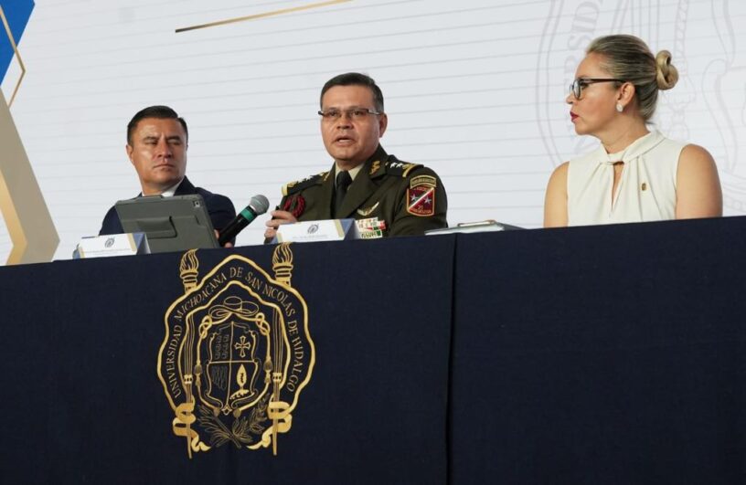 Es muy importante que sepan todos ustedes, no venimos a militarizar nada, sí venimos a participar si ustedes así me lo piden, pero no con las armas sino con el conocimiento, afirmó el general de Brigada, Fernando Colchado Gómez, comandante de la 21 Zona Militar, al dictar la conferencia “Difusión de la cultura de Seguridad Nacional”, en la que estuvo acompañado por la rectora de la Universidad Michoacana de San Nicolás de Hidalgo (UMSNH), Yarabí Ávila González.