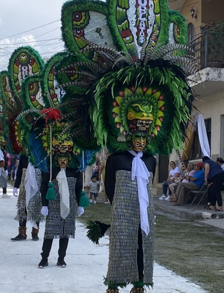 Niños, mujeres y hombres danzan con las máscaras gigantes representando a guerreros prehispánicos. Se trata de imágenes elaboradas por las propias manos de quienes año con año ofrendan su trabajo al patrono.