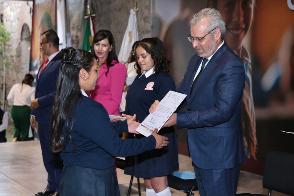 Con un reconocimiento a la vocación de las y los maestros, el gobernador Alfredo Ramírez Bedolla, y la secretaria de Educación, Gabriela Molina Aguilar, encabezaron el acto de clausura del ciclo escolar 2022-2023, en la secundaria Técnica No. 13, Internado Femenil “La Huerta”.