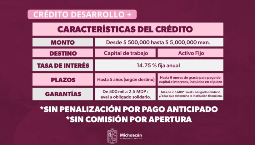 En este sentido, explicó que se tiene el objetivo de colocar 170 créditos aproximadamente con tasas preferenciales de 14.75 por ciento anual, para consolidar las empresas michoacanas frente al nearshoring, como proveeduría local.