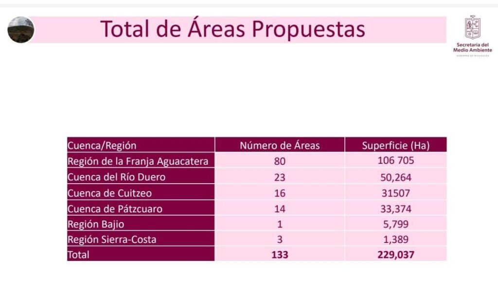 De acuerdo con el titular de la Secretaría de Medio Ambiente (Secma), Alejandro Méndez López, las reservas incluyen zonas como la franja aguacatera, donde se contempla el mayor número de decretos y serían 80 en total en 10 municipios con una extensión conjunta de 106.7 mil hectáreas.
