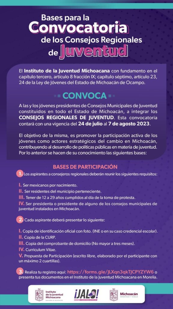 El Instituto de la Juventud Michoacana (Ijumich) ha dado un paso trascendental al lanzar una convocatoria para conformar por primera vez los Consejos Regionales de Juventud, para la elaboración de estudios y proyectos orientados al desarrollo integral.