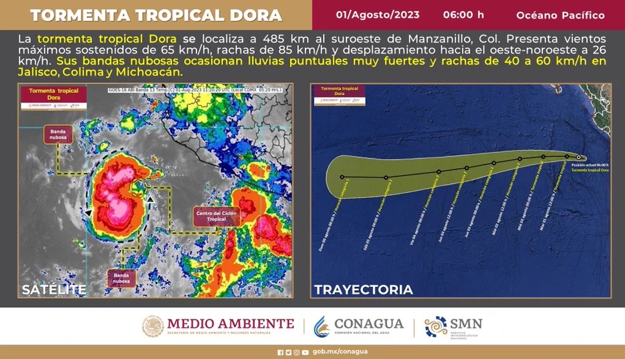 Aun cuando la tormenta tropical Dora, se aleja de las costas del Pacífico, sus efectos podrán provocar este día lluvias fuertes en gran parte del estado de Michoacán, de ahí el llamado a mantenerse alertas y actuar en consecuencia en caso de ser necesario.