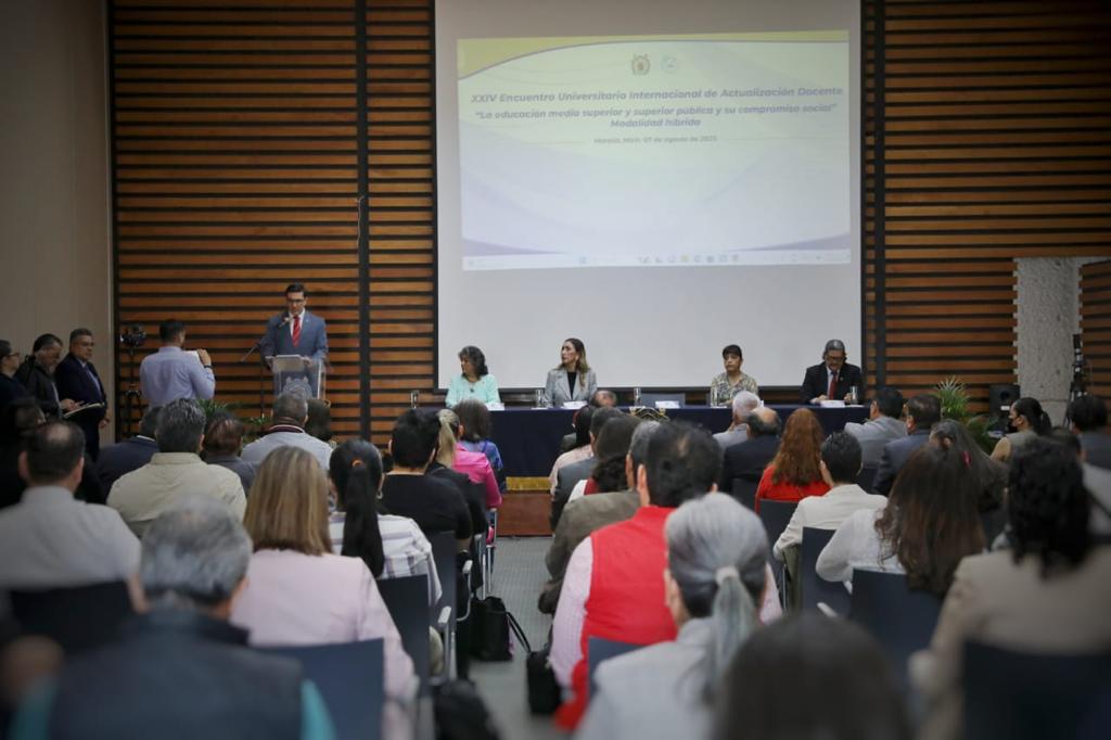 “Nosotros estamos modernizándonos, cuando la rectora Yarabí Ávila González expresó hace más de siete meses que la Universidad Michoacana tenía que cumplir a cabalidad con una oferta educativa pertinente a las necesidades, hablada justamente de ir modernizándonos en nuestros planes de estudios sin trastocar derechos de nadie, más que apostándole a ponderar el interés de los estudiantes quienes hoy nos demandan nuevas ofertas de desarrollo”, afirmó el secretario Académico, Jorge Fonseca Madrigal, al inaugurar el XXIV Encuentro Universitario Internacional de Actualización Docente “La educación media superior y superior pública y su compromiso social”.