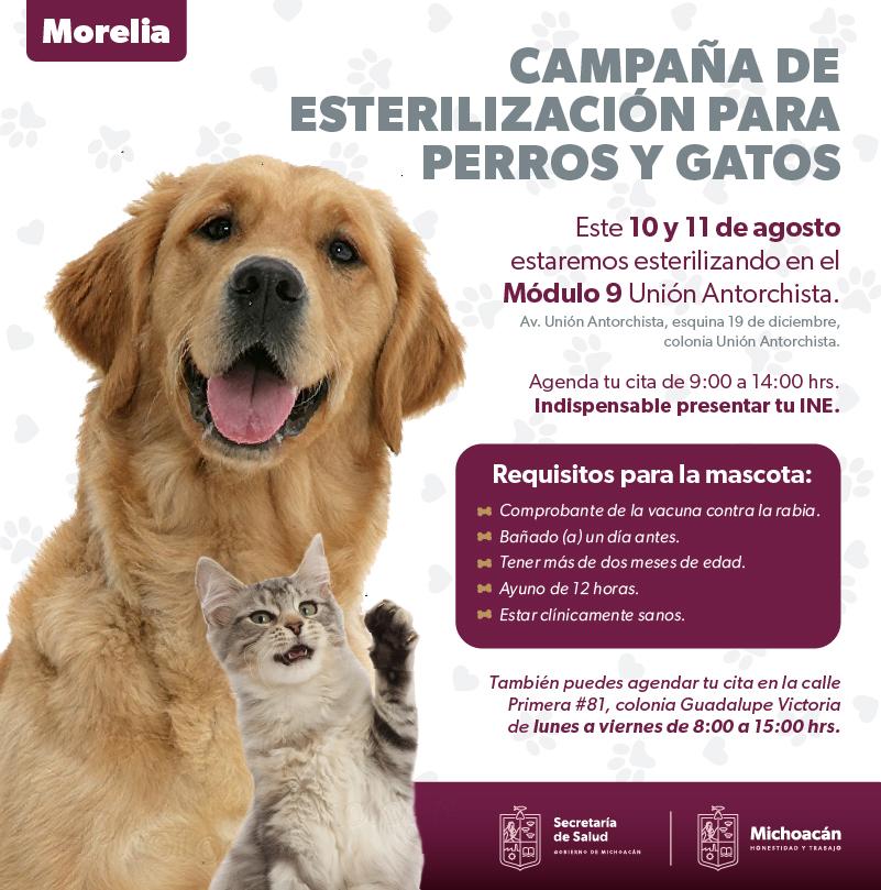 La Secretaría de Salud de Michoacán (SSM) llevará a cabo los días jueves 10 y viernes 11 de agosto su campaña de esterilización canina y felina en la colonia Unión Antorchista de Morelia, con el objetivo de controlar la población de perros y gatos en situación de calle.