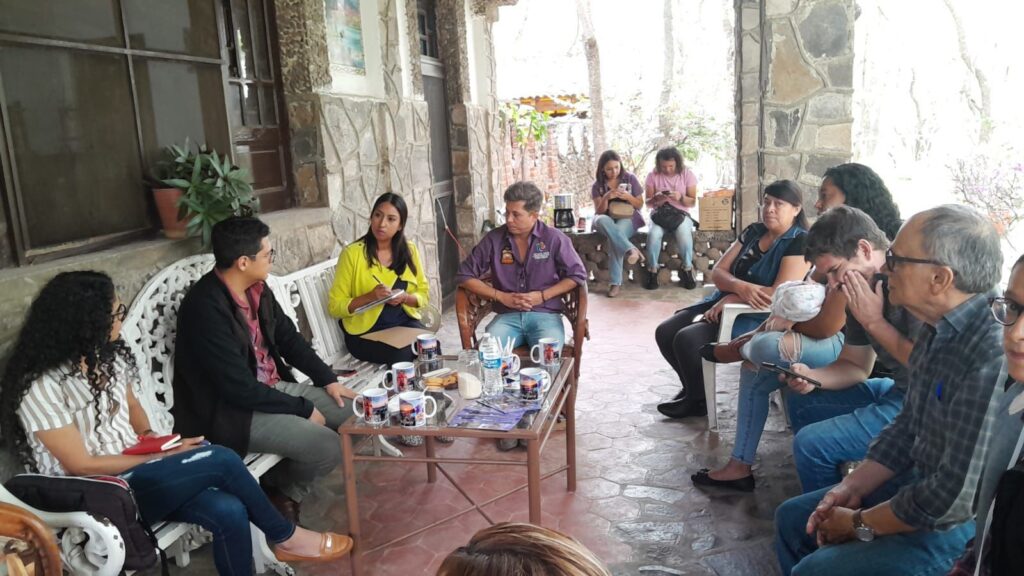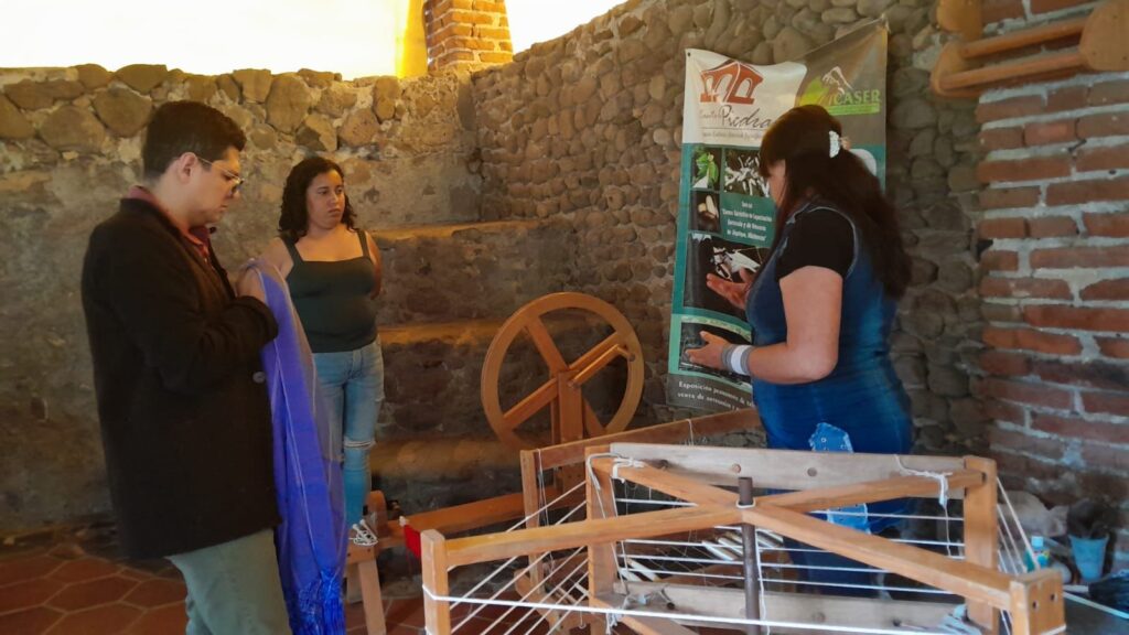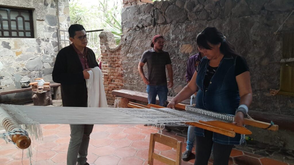 Durante una visita al sector artesanal de la Casita de Piedra, el director general del IAM, Cástor Estrada Robles, platicó con las artesanas y artesanos que crían al gusano de seda para la elaboración de sus textiles, en el Centro Turístico de Capacitación Sericícola y Rebocería de Jiquilpan.