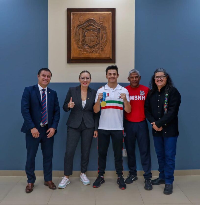 La rectora Yarabí Ávila González, acompañada por los secretarios general, Javier Cervantes Rodríguez, y de Difusión Cultural y Extensión Universitaria, Miguel Ángel Villa Álvarez, recibieron al campeón y al entrenador, Jesús Tejeda, quienes compartieron las experiencias vividas en esta justa celebrada en Canadá, y pronosticaron extraordinarios resultados en la próxima sede.