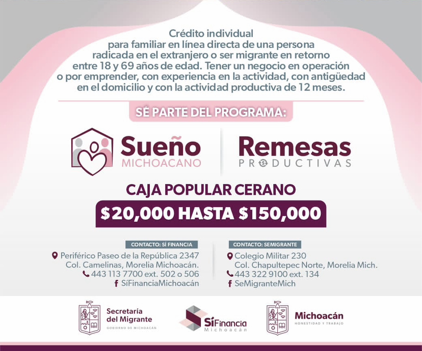 El programa insignia de la Secretaría del Migrante (Semigrante), Sueño Michoacano en su modalidad Remesas Productivas, ofrece una opción de crédito para la población con familiares radicados en el extranjero o a migrantes en retorno, para iniciar o desarrollar un negocio.