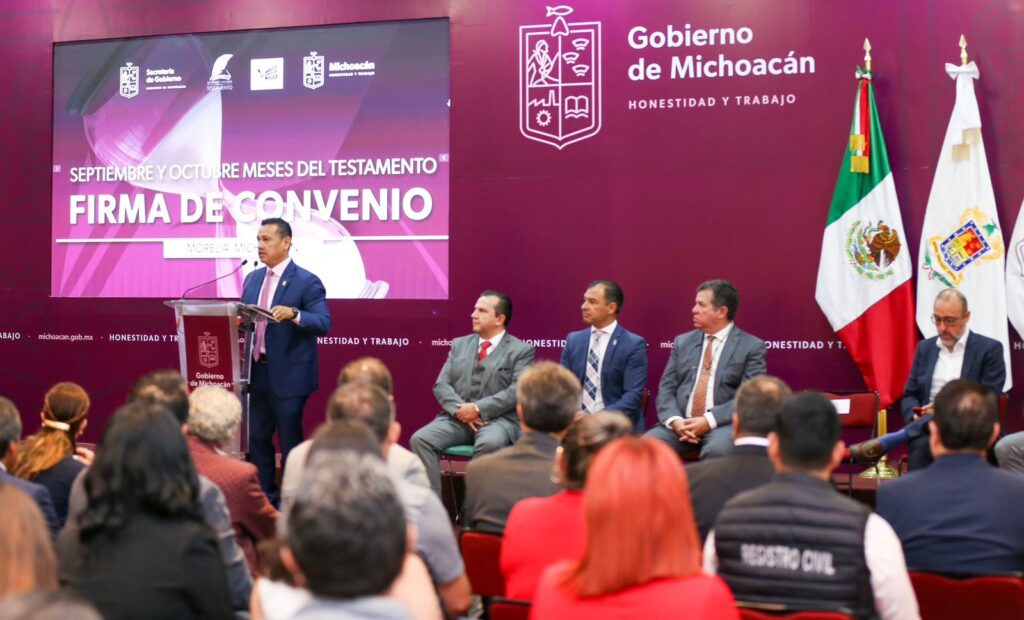Lo anterior, durante su participación en la firma del Convenio de Colaboración en Materia de Prestación de Servicios Notariales a Bajo Costo, por motivo de los meses del testamento, signado entre la Secretaría de Gobierno y el Colegio de Notarios de Michoacán.