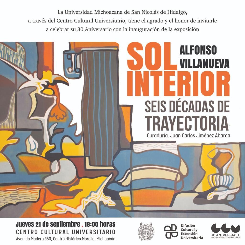 El creador michoacano, profesor nicolaita y Premio Estatal de las Artes Eréndira 2023, Alfonso Villanueva, nos comparte su talento a través de la exposición “Sol interior. Seis décadas de trayectoria”, misma que estará disponible a partir de hoy, en punto de las 18:00 horas, en las instalaciones del Centro Cultural Universitario (CCU).