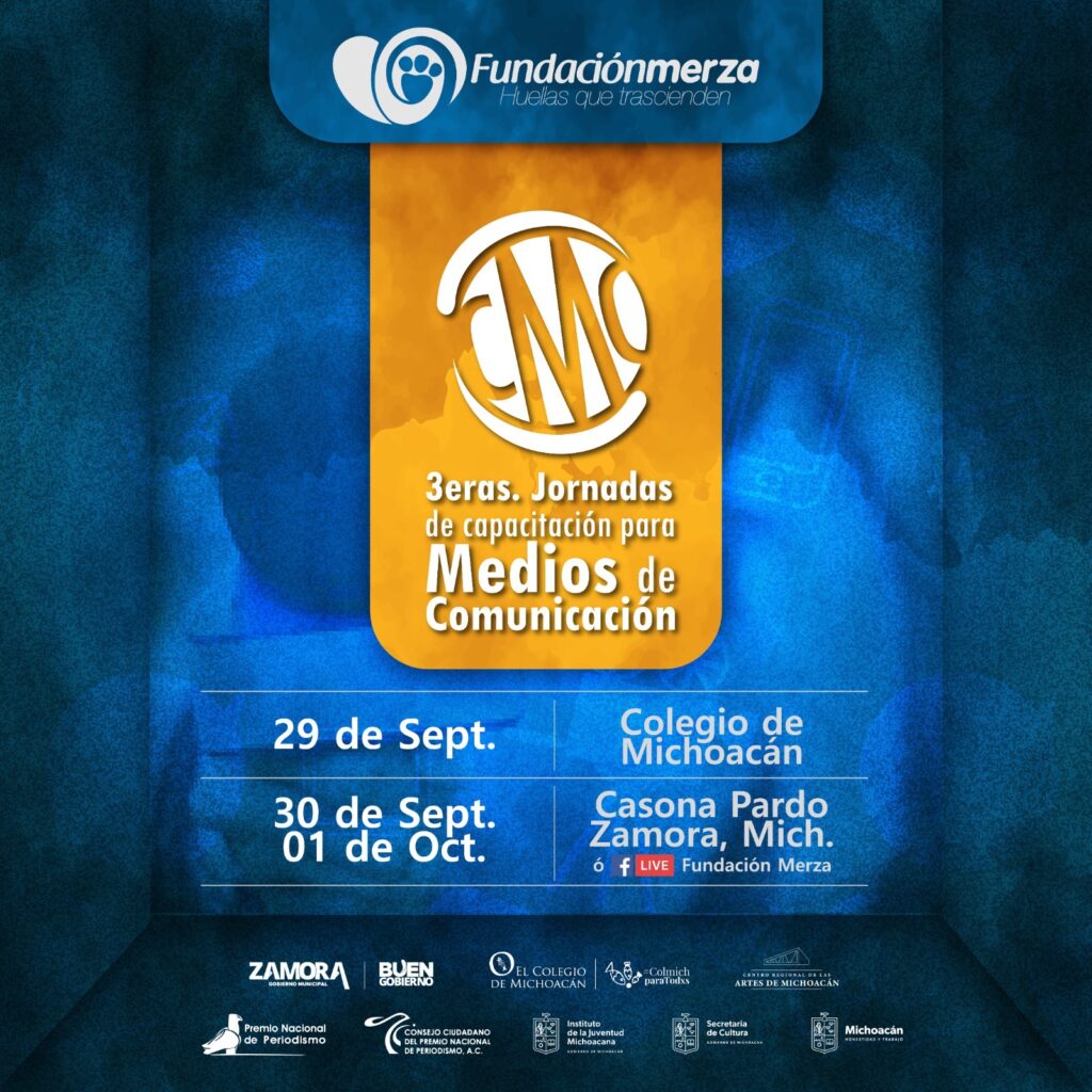 Con la finalidad de coadyuvar en la profesionalización y sumar a la labor de quienes ejercen el periodismo, brindando nuevas herramientas y oportunidades para un óptimo desempeño, Fundación Merza y la Coordinación General de Comunicación Social del Gobierno de Michoacán, invitan a las terceras Jornadas de Capacitación a Medios de Comunicación, del 29 de septiembre al 1 de enero en Zamora, Michoacán.