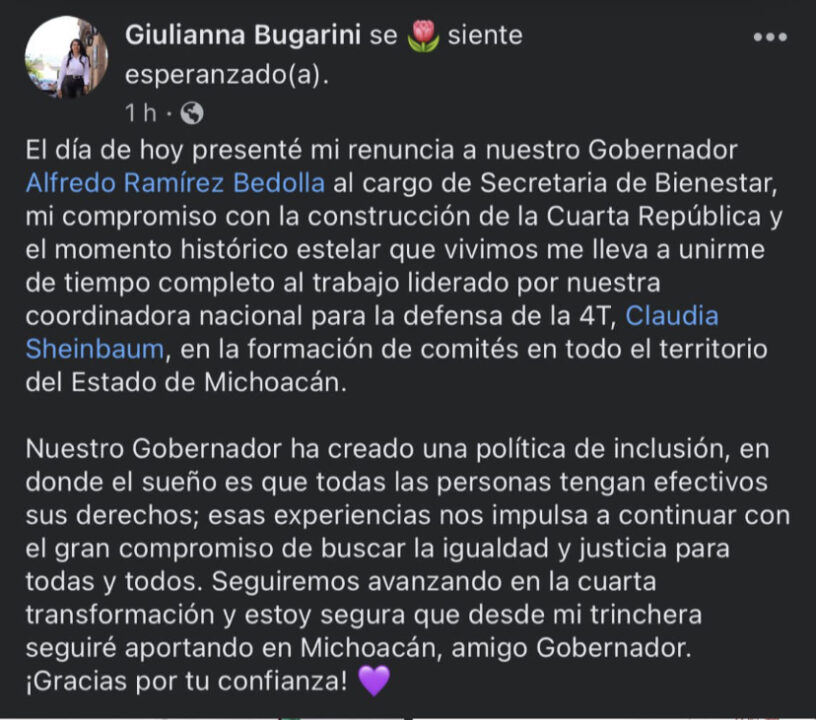 A nueve meses y 14 días de haber tomado posesión como titular de la Secretaría del Bienestar del Estado, Giulianna Bugarini Torres renunció la tarde de este miércoles al cargo para sumarse a la formación de comités de apoyo a la eventual candidatura de Claudia Sheinbaum a la presidencia de la República.