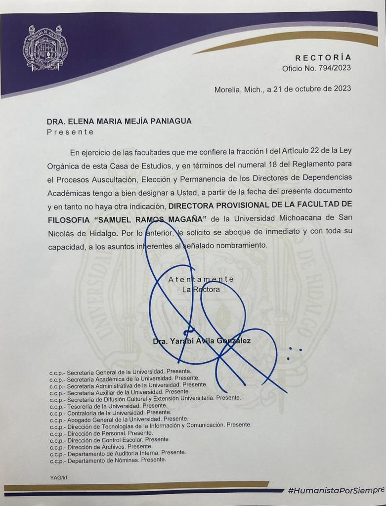 Elena María Mejía Paniagua ha recibido el nombramiento de directora provisional de la Facultad de Filosofía “Dr. Samuel Ramos Magaña”, de la Universidad Michoacana de San Nicolás de Hidalgo (UMSNH), luego de que Carlos Bustamante Penilla presentara su renuncia al cargo. Mañana a primera hora asumirá formalmente la encomienda.