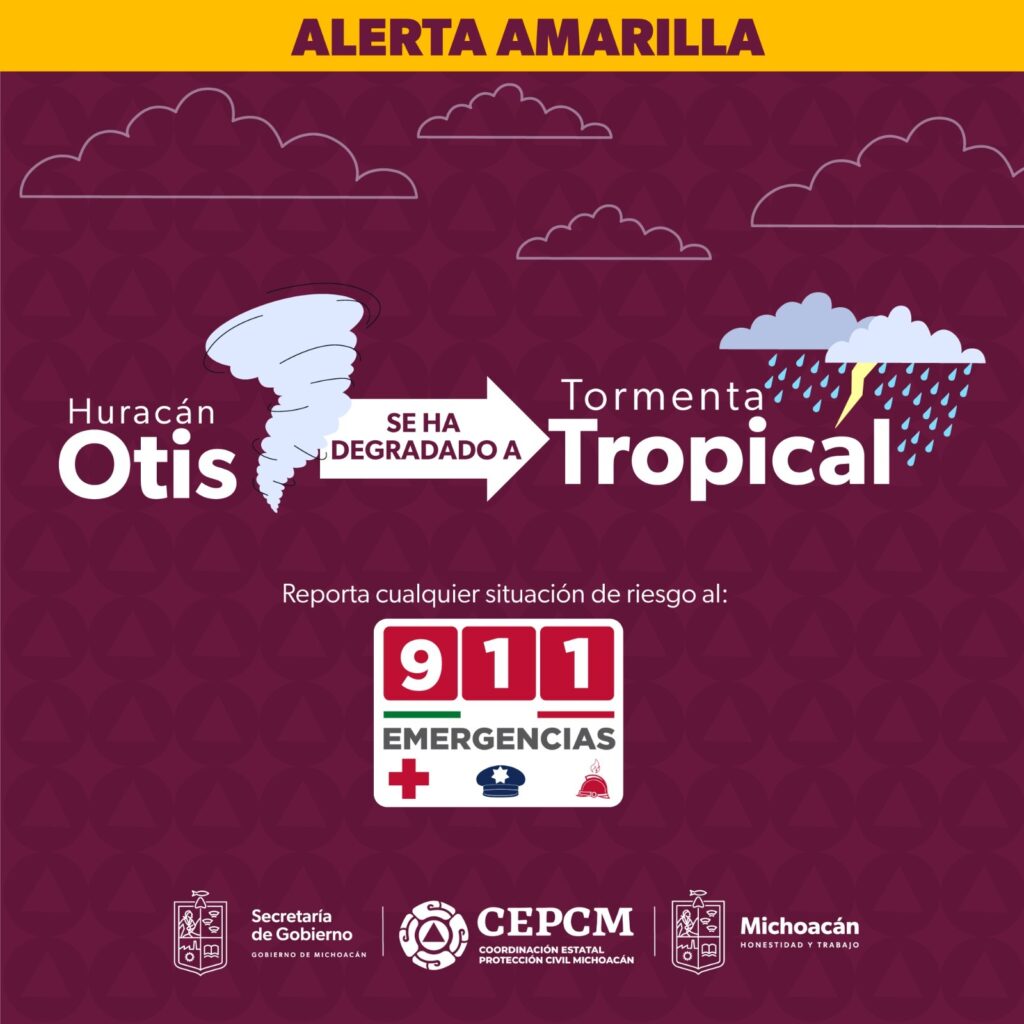 Otis se degradó a tormenta tropical, sin embargo la probabilidad de lluvias fuertes prevalece en gran parte de Michoacán, por lo que la Coordinación Estatal de Protección Civil declaró alerta amarilla en 20 municipios.
