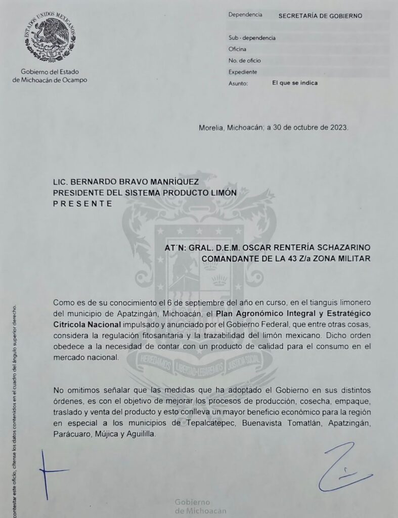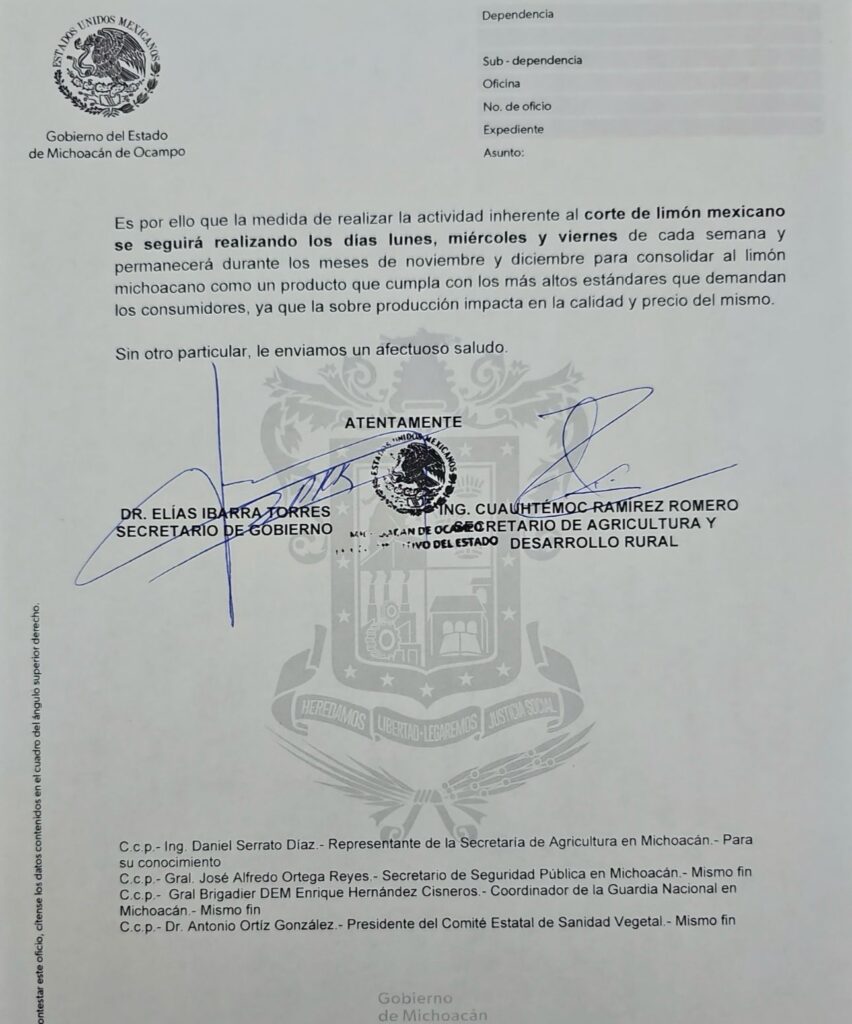A través de un oficio dirigido al presidente del Sistema Producto del Limón, las autoridades estatales señalan que Tepalcatepec, Buenavista Tomatlán, Apatzingán, Parácuaro, Mújica y Aguililla son los municipios donde aplicará esta medida que ordena la administración del presidente Andrés Manuel López Obrador.