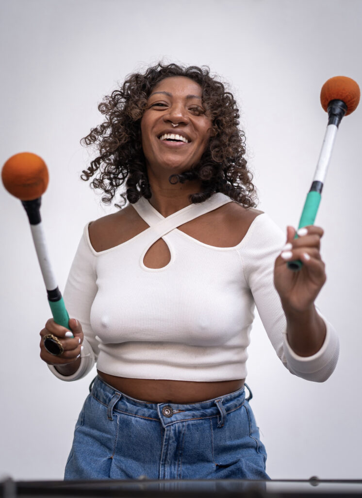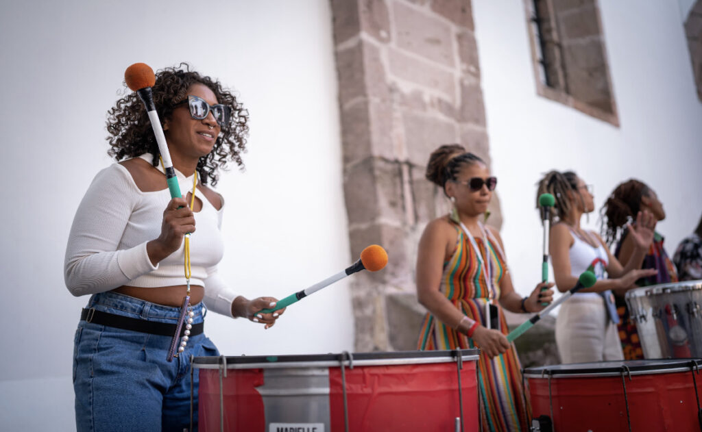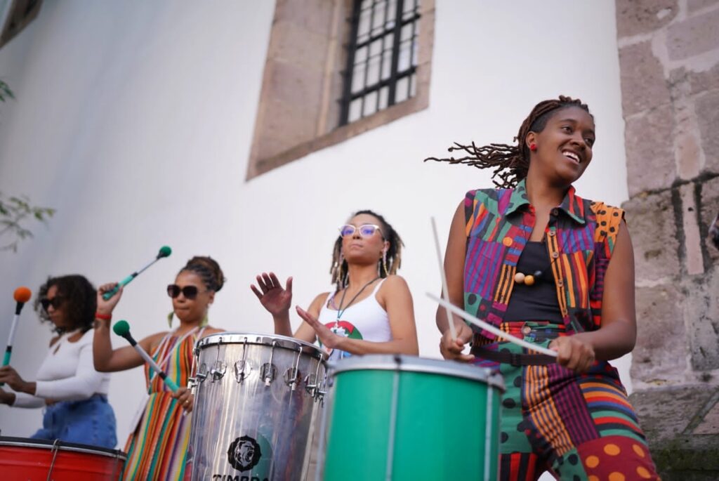 Desde 2015 este grupo percusivo completamente femenino utiliza el escenario como medio para expresar sus voces, colores, tambores y bailes originales, arraigados en la cultura popular de Brasil y sus raíces afrobrasileñas.