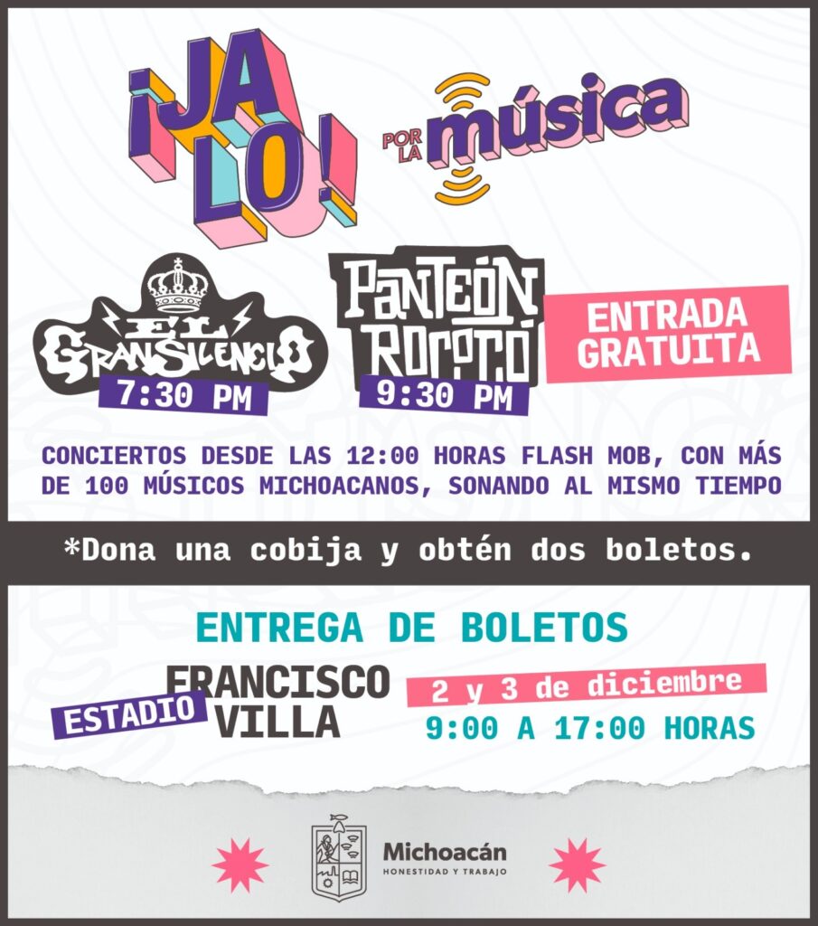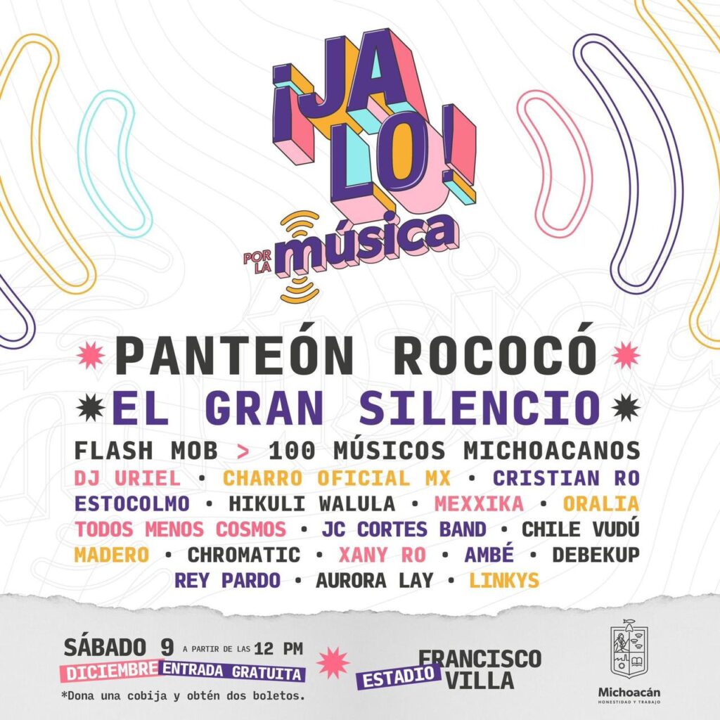 Los próximos sábado 2 y domingo 3 de diciembre, el Gobierno del Estado, a través del Instituto de la Juventud Michoacana (Ijumich), iniciará la entrega de pulseras para el Festival Jalo por la Música en el estacionamiento del Estadio Francisco Villa de 9:00 a 17:00 horas, donde se presentará Panteón Rococó, El Gran Silencio y 18 bandas locales.